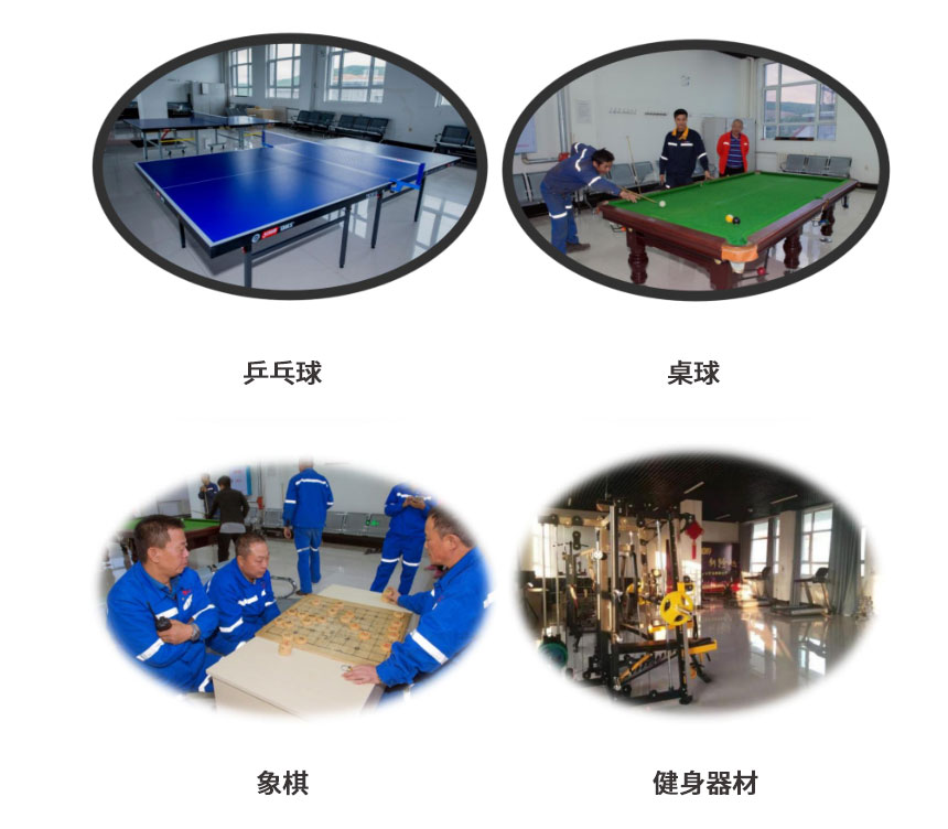 活動室設有羽毛球、乒乓球、桌球、跑步機、健身器、棋牌、總計 1300 多平,供員工業余時間健身、娛樂、休閑。