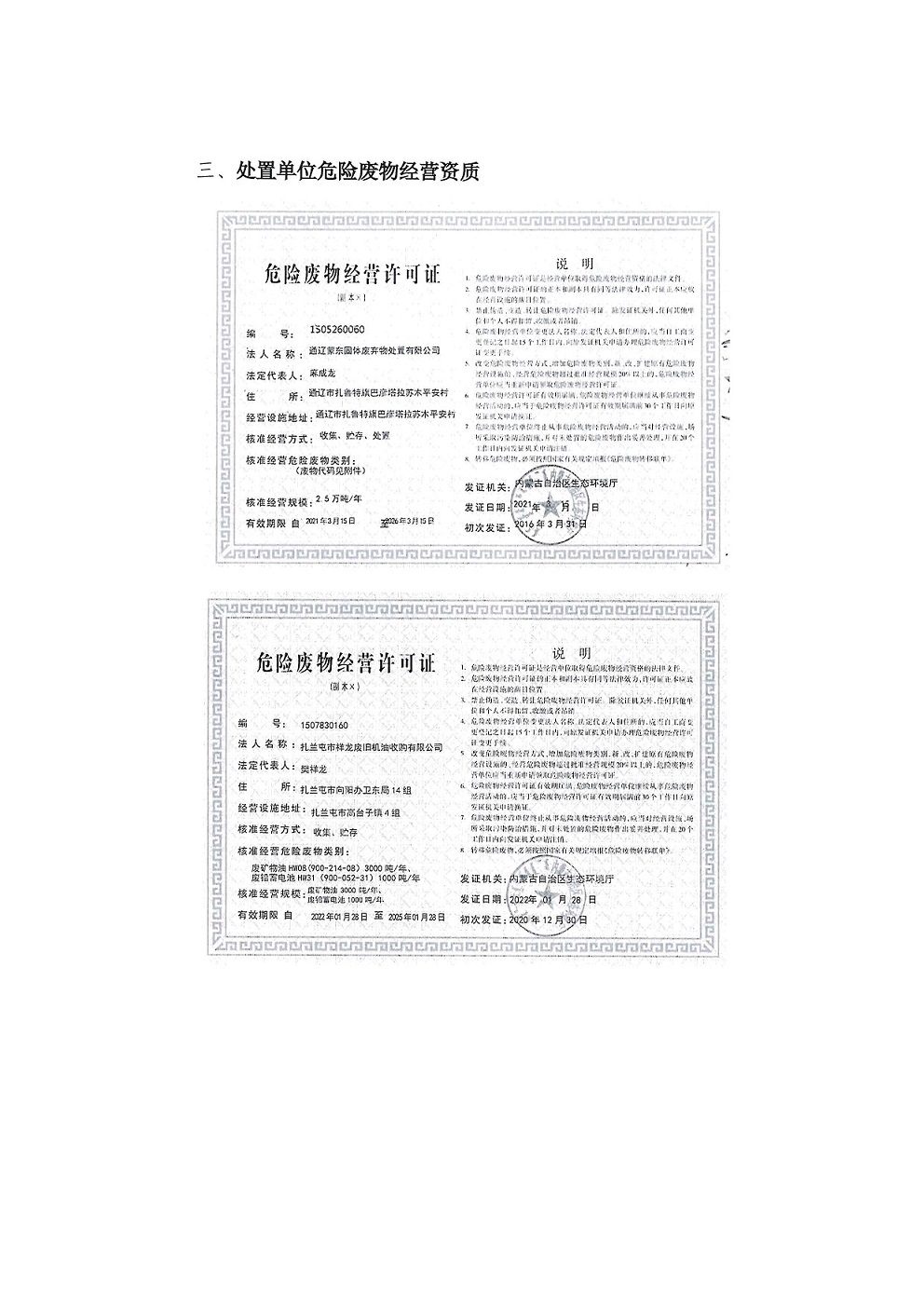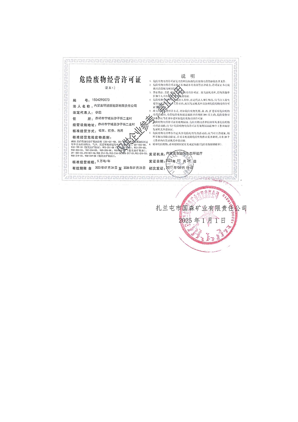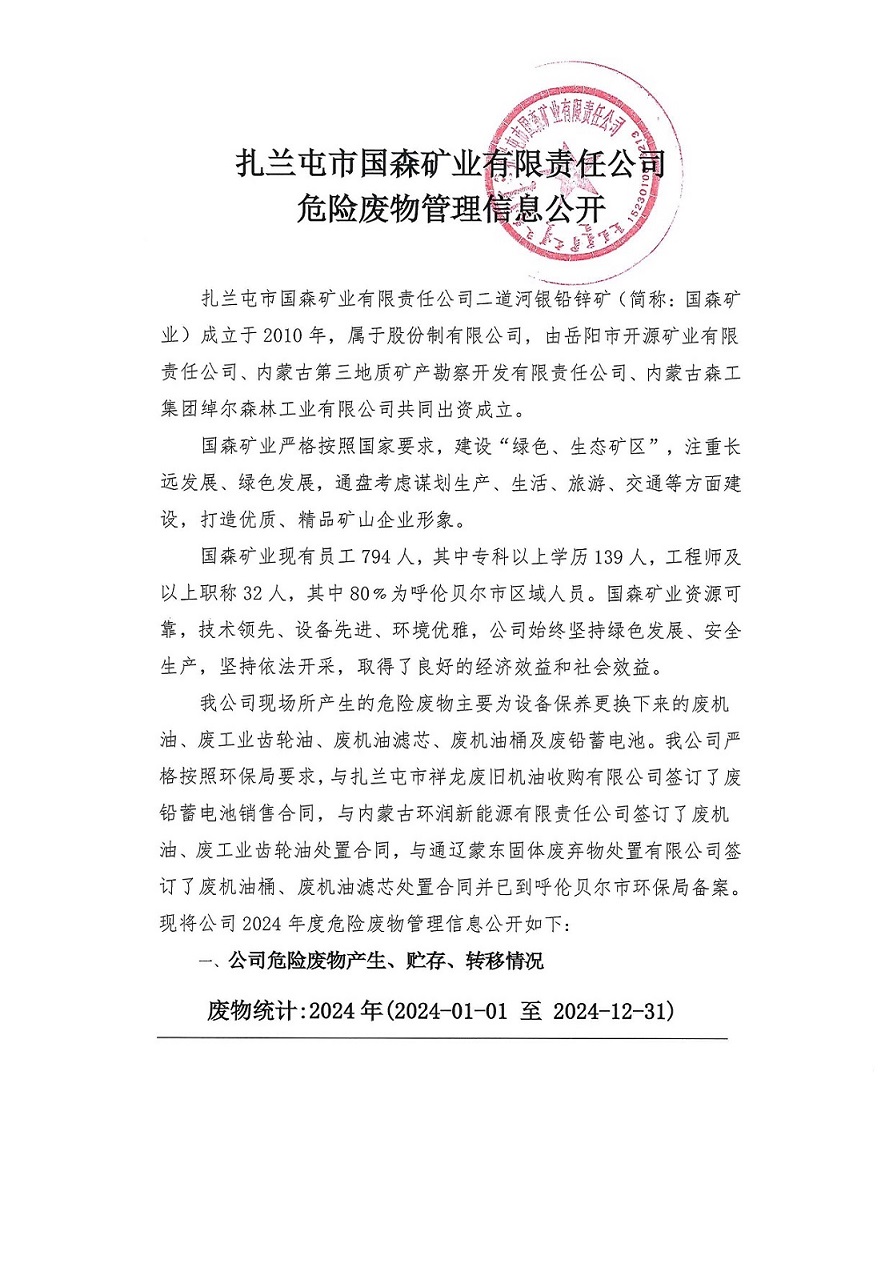 扎蘭屯市國森礦業有限責任公司危險廢物管理信息公開